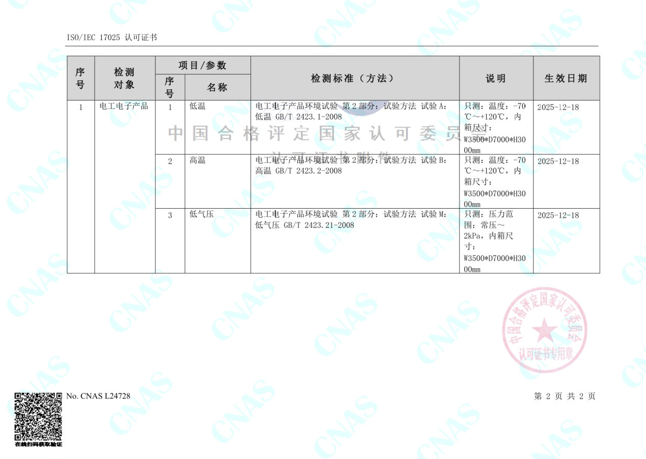 积极推进步入式高低温环境仓标准化建设,成功获得高温、低温、低气压三项国家标准(GB/T2423.1-2008、GB/T2423.2-2008、GB/T2423.21-2008)认证,标志着中心在环境试验能力建设方面取得重要进展,可全面支撑航空航天、陆装等领域核心部件的环境适应性实验验证,进一步拓展中心在高端装备研发支撑领域的服务范围与保障能力得到,持续为相关行业提供高水平技术服务和实验支撑。