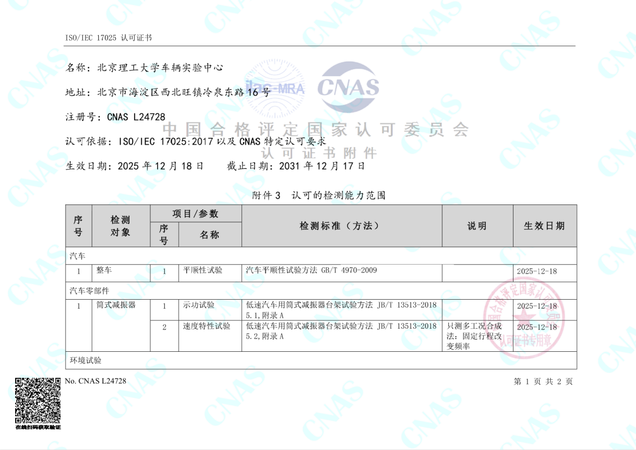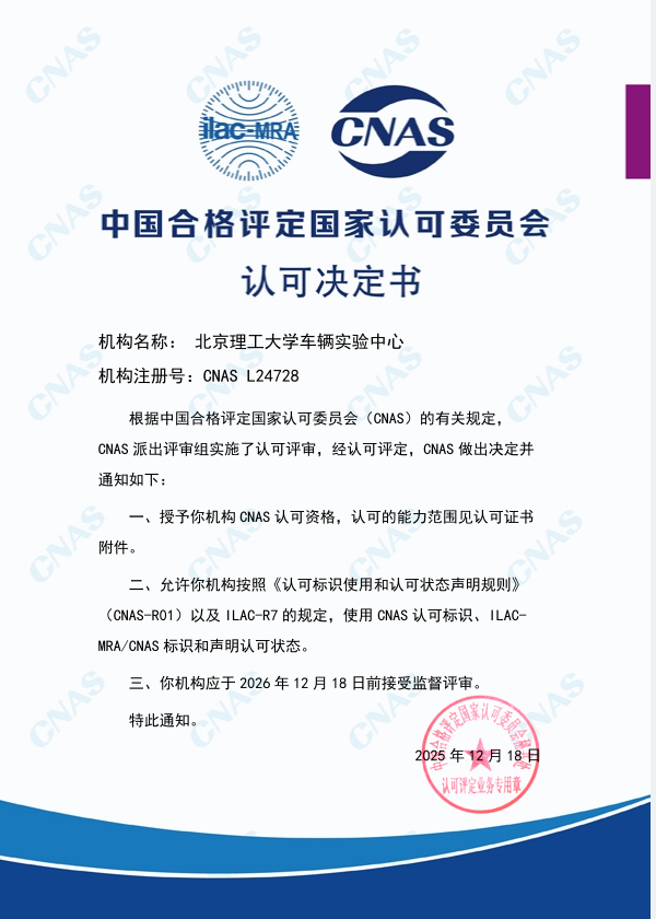 2025年12月24日,18直播-av直播 校级公共平台车辆实验中心正式公布获批国家实验室认可(CNAS)的资质认证。